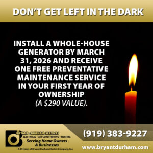 Contact Bryant-Durham Services today to learn more about whole-house generator installation and take advantage of this limited-time offer. Because when the lights go out, you deserve to stay powered.